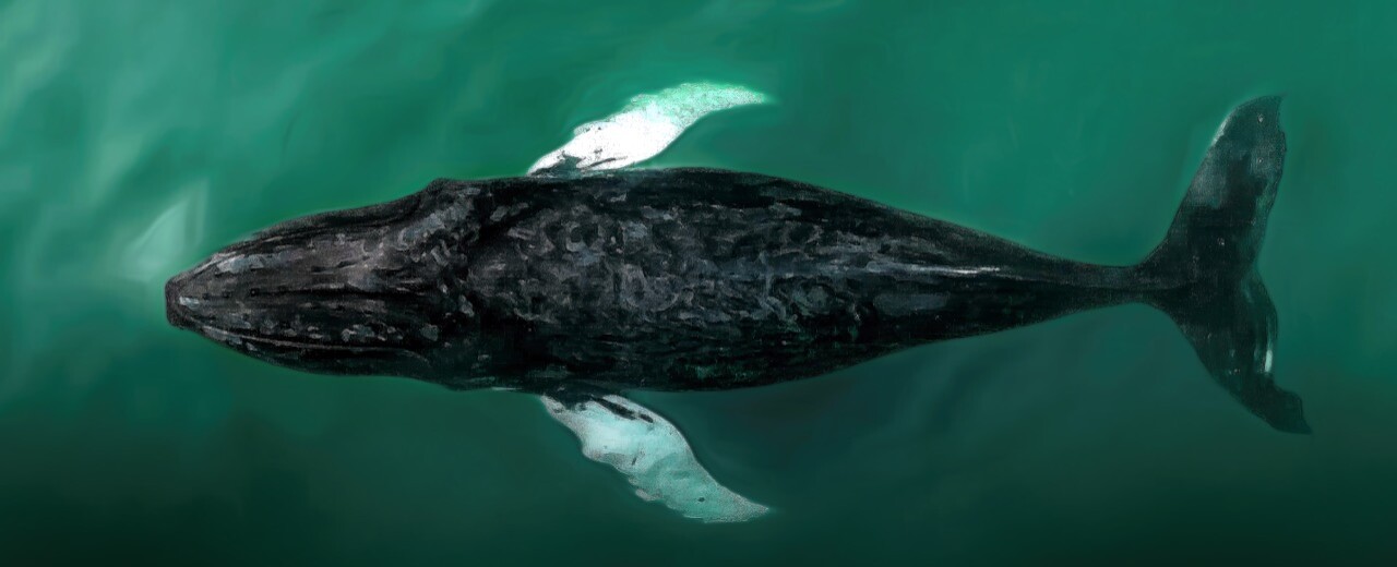 A humpback whale breaches the surface of the ocean, its giant black-and-grey silhouette fringed with white fins, seen from above creates a truly breathtaking spectacle as it emerges from the bottle-green Atlantic waters.