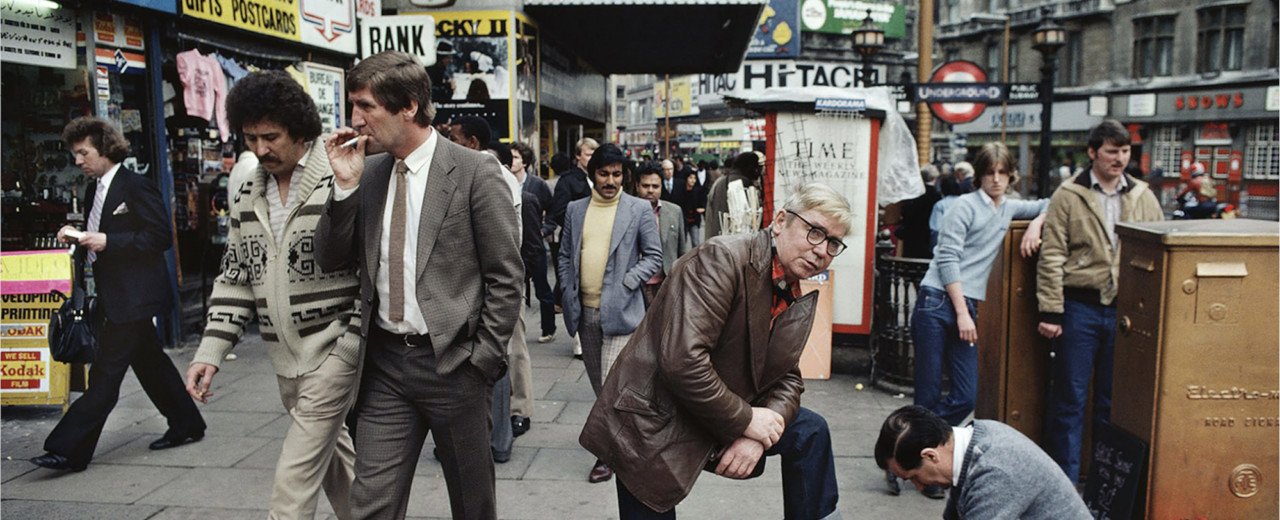 Renowned for his subversive approach to the medium, William Klein’s depiction of London’s Piccadilly at the turn of the 1980s is typically instinctive and multi-layered. The exclusively male clientele perhaps attests to the then seedy composite of the area, and, along with the collage of brazen advertisements, creates a palpable sense of brash masculine energy that, in many ways, epitomizes the period.