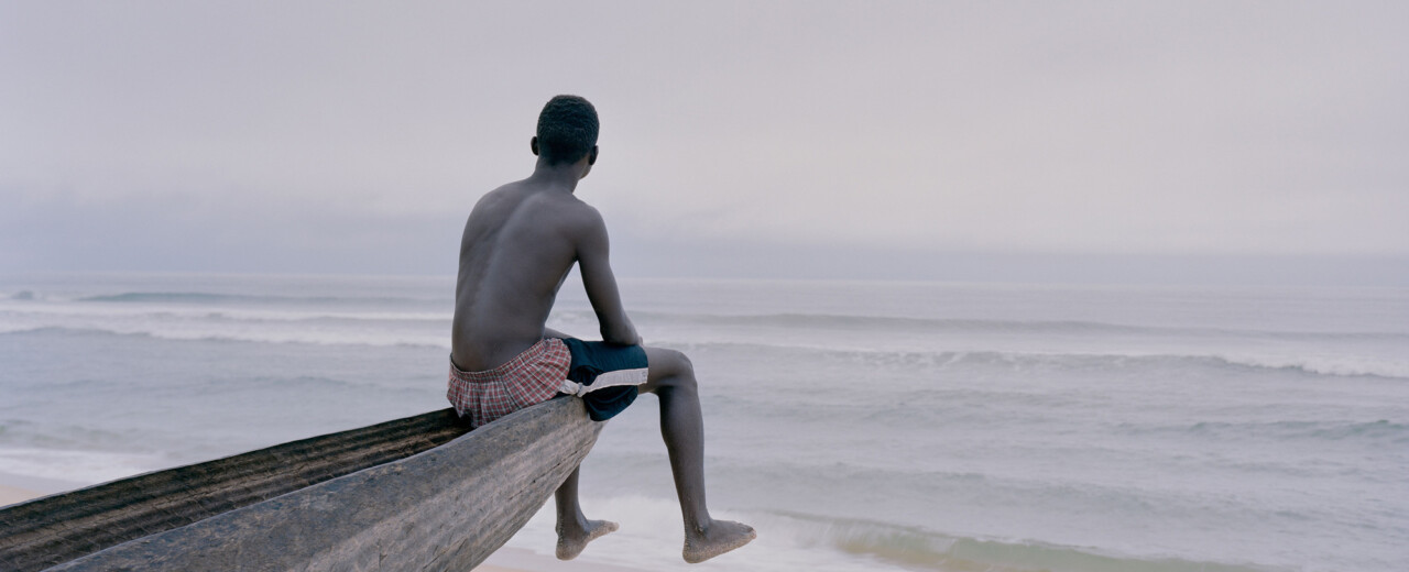 Color portrait documentary photography by Elliott Verdier, boys on beach, Liberia, sunrise