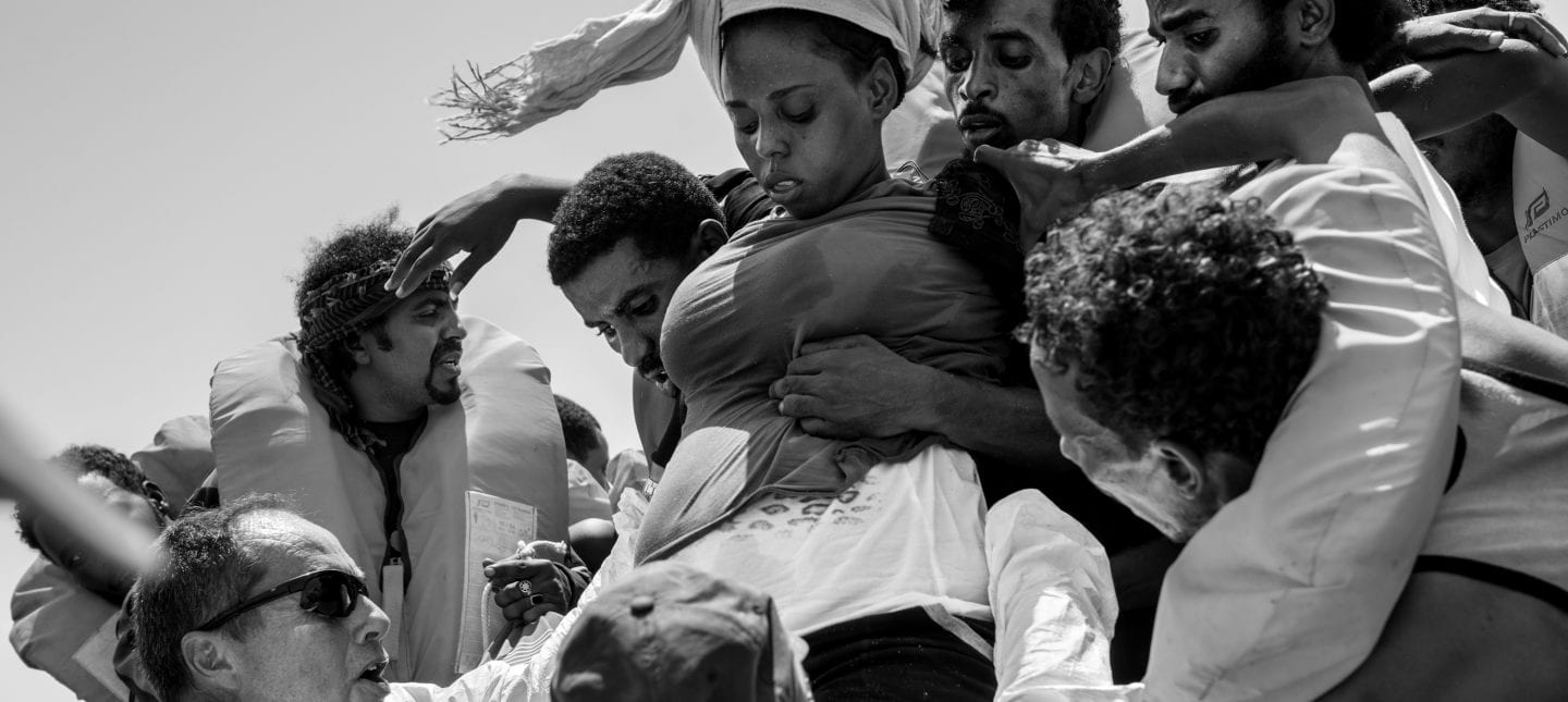 In this photograph I see a strong content related to spot news, that acquires even more power and deeper levels of reading through the use of black and white. The photographer has been able to transform a single action into something that not only reaches a more collective meaning but also produces an impression that can grasp the intimacy of the viewer. For me this photograph brings the tension and the energy of the “Le Radeau de la Méduse” painting into the narration of a modern tragedy.”