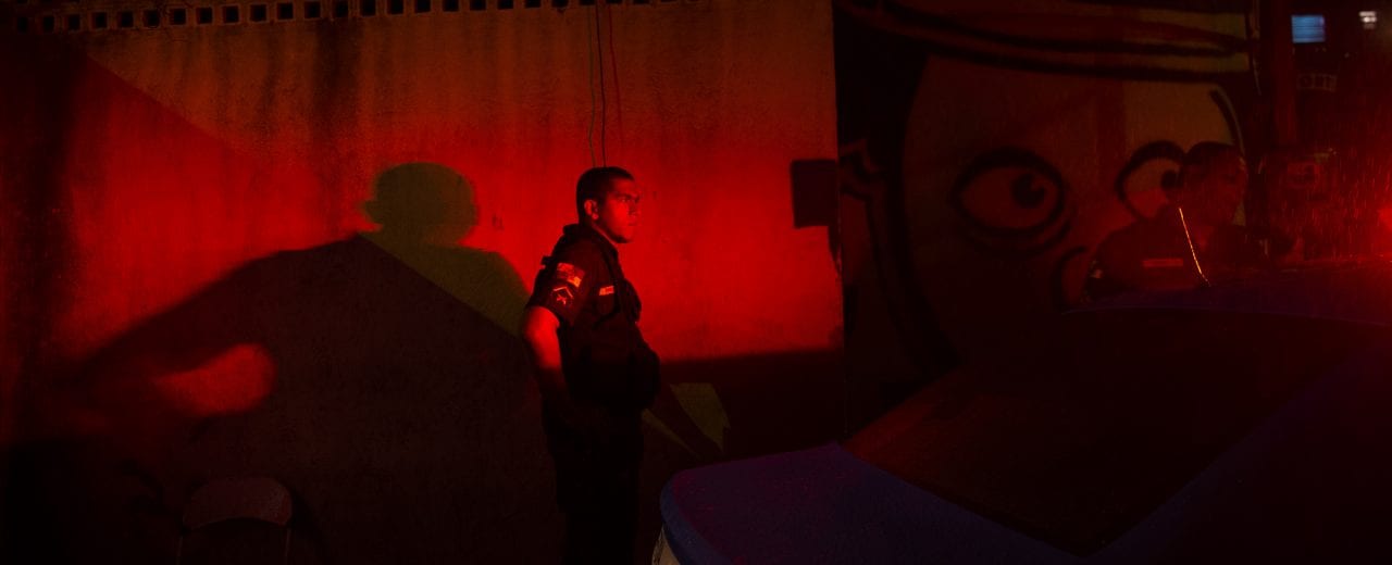 Officers of the UPP (Pacifying Police Unit), a law enforcement unit which controls some of Rio’s favelas, atop Vidigal favela, Rio de Janeiro, on August 18, 2016. From the series: “Darkness and Hope in Brazil’s Favelas”.